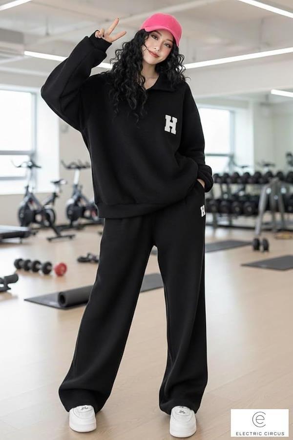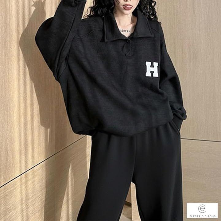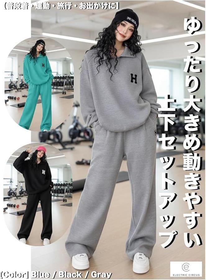 「ゆったり大きめスポーティーなリラックスウエア」らくちんウエストゴムのボトムス(ポケット付き)とコーディネートで使いやすいハーフジップ・幅広い年齢層におすすめ