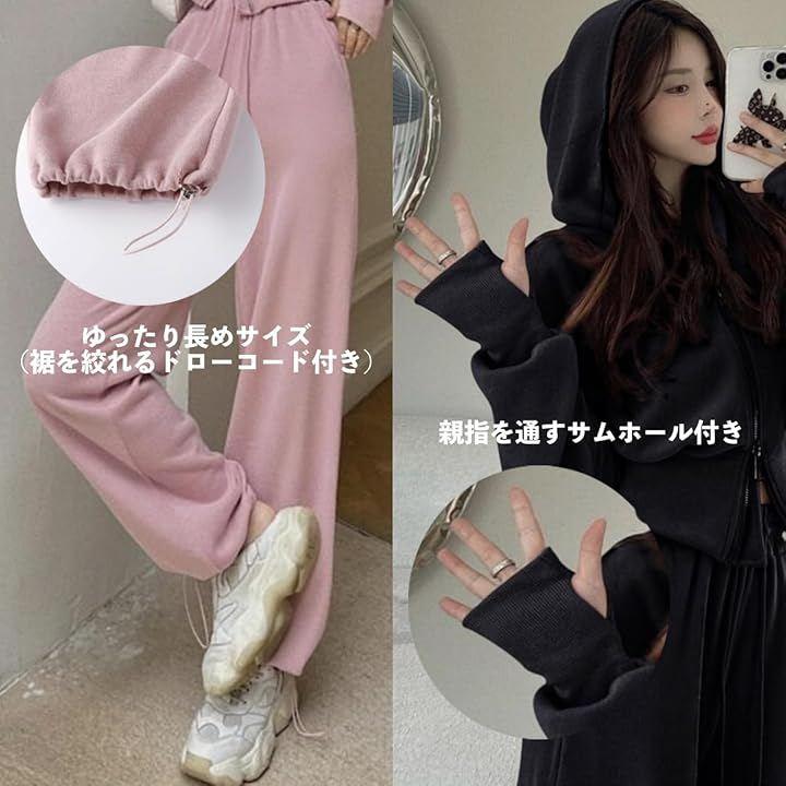 「通勤・運動・旅行・お出かけに」スラックスで楽なのにちゃんとかわいい・ジムやトレーニングの移動着に・伸縮性のあるジャージ素材と軽い着心地・動きやすいデザイン・らくちんウエストゴムのボトムス(ポケット付き)・普段着からアクティブシーンに、旅行やちょっとしたお出かけにも使える・幅広い年齢層におすすめ 「ゆったり長めサイズ(裾を絞れるドローコード付き)」コーディネイトしやすい自由な履き心地 「親指を通すサムホール付き」快適なカジュアルスタイル