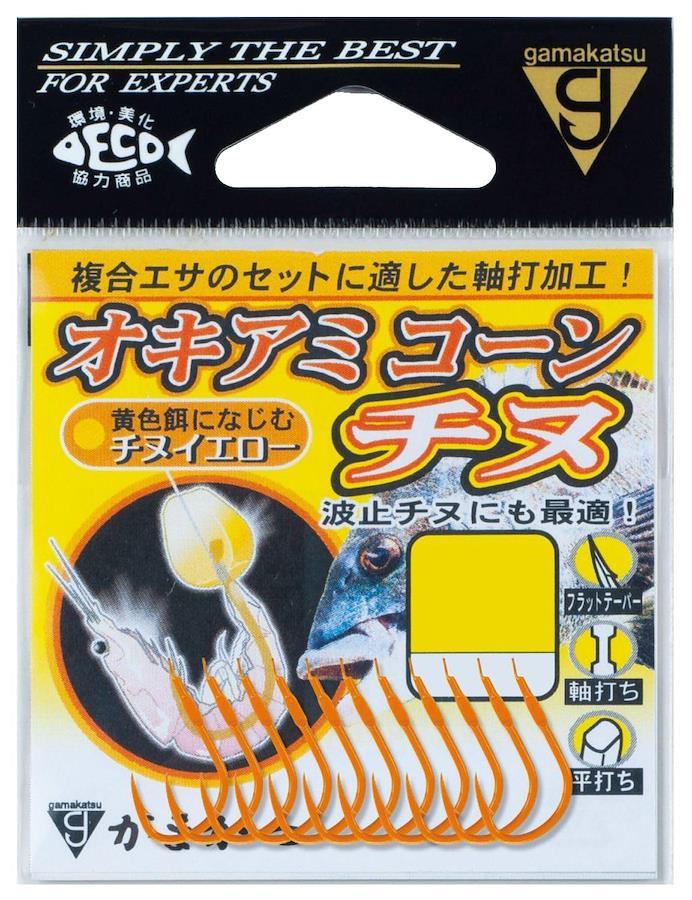 複合エサに適した軸部プレス加工! 黄色のエサになじむチヌイエロー! 「複合エサ」は、異なる種類のエサを鈎にセットすることでサシ餌のシルエットやカラーをボリュームアップさせ、チヌの好奇心を刺激します。エサ取りが多い場合も、コーン・サナギ等をオキアミと組み合わせることによりエサ持ちアップ! チヌを仕留めるには必要不可欠な喰わせ手法です。「オキアミコーンチヌ」は、この複数のエサの鈎ズレを防ぐために軸部にプレス加工を施しました。カラーは、コーンや黄色いネリエになじみ、チヌへの強いアピール効果も持ち合わせた「チヌイエロー」を採用。鈎に残された噛み跡により魚種やサイズを判断することもできます。鈎先は、強度と貫通性能を向上させた「フラットテーパー」により、チヌの硬い口周りであってもしっかりとした鈎掛かりを約束します。