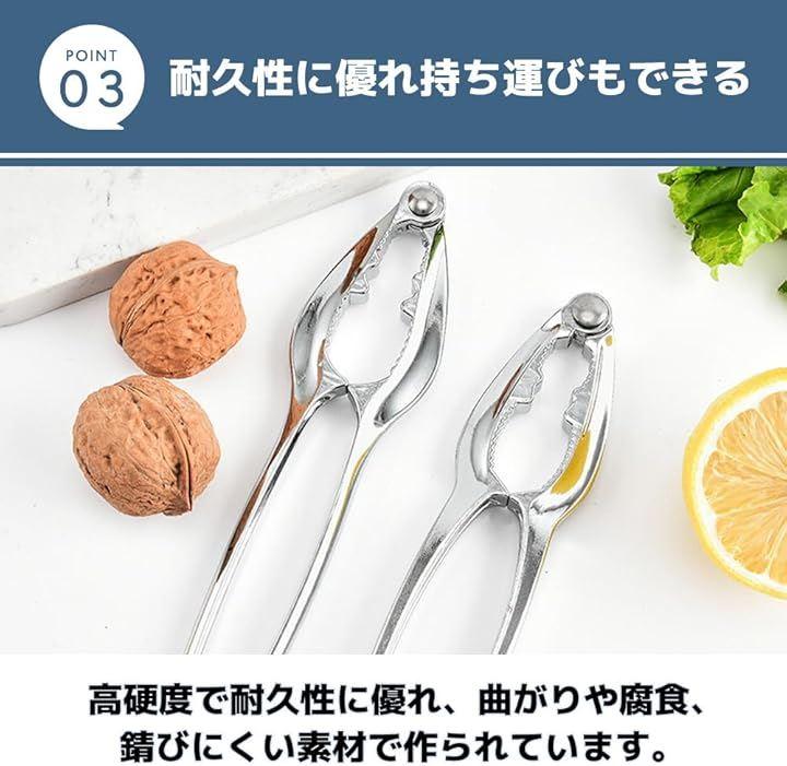 「耐久性に優れ持ち運びもできる」亜鉛合金にクロムメッキを施したくるみ割り器は、高硬度で耐久性に優れ、曲がりや腐食、錆びにくい素材で作られています。