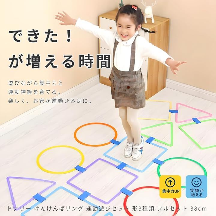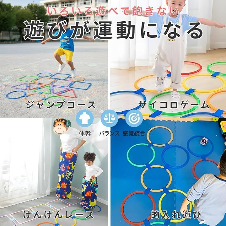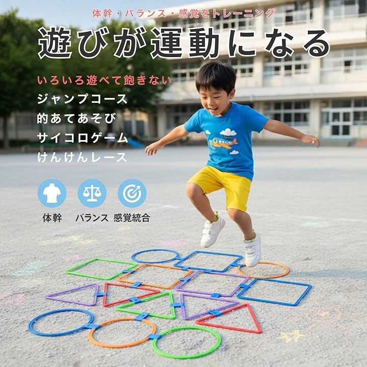 「遊びながら鍛える、学べる教具」 けんけんぱりんぐを並べてジャンプするだけで、遊びがトレーニングに変わります。