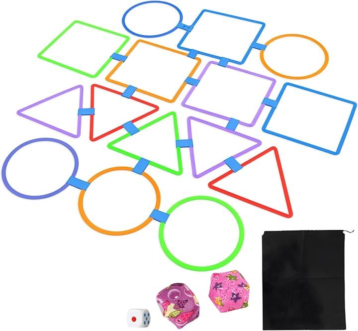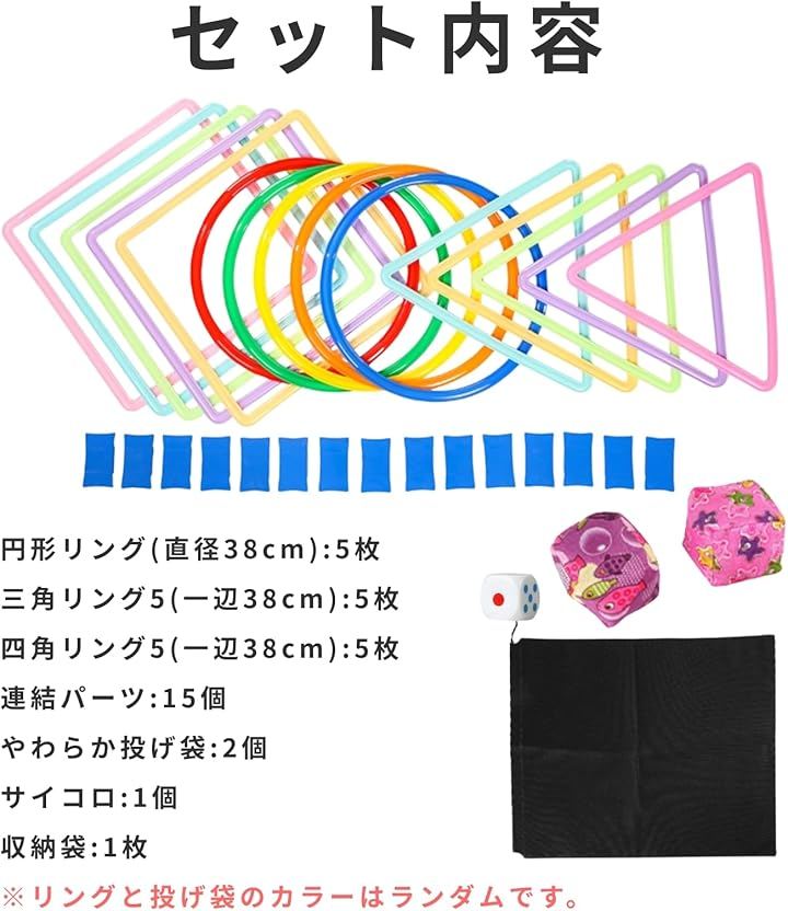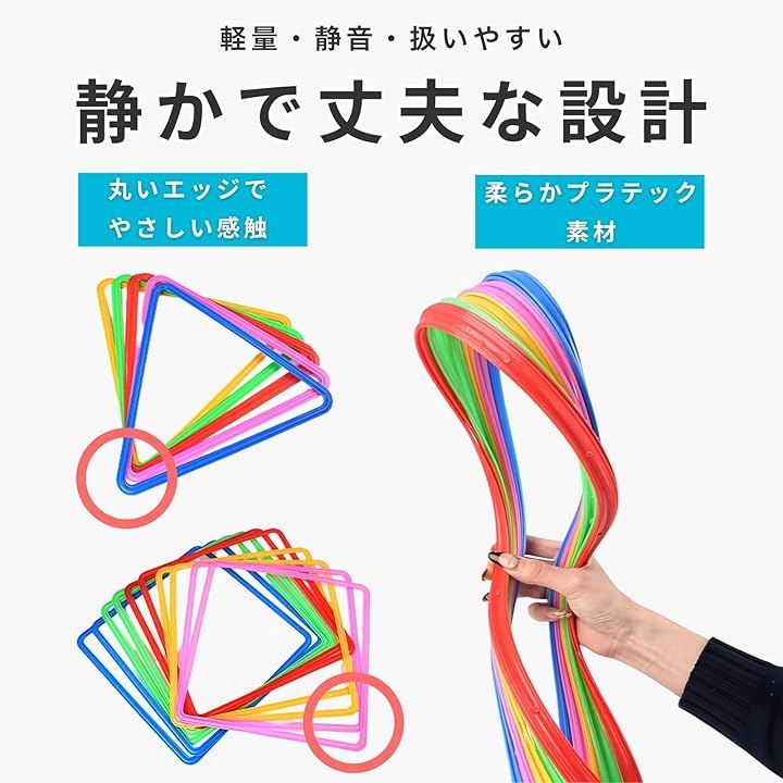 円・三角・四角の3種類の形を組み合わせて自由にコースを作れる跳び輪セットです。
