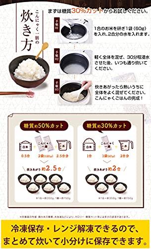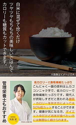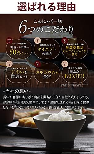 通常1-5営業日で発送いつもの食事で糖質49%、カロリー50%カット※1 いつものお米に混ぜて一緒に炊くだけでボリュームはそのままに糖質49%、カロリー50%カット!※1 お腹は大満足なのに、こんにゃく米入りのご飯を3食食べるだけで1日に摂取する糖質・カロリーを大幅にカットできます。 白米のみ食べた場合とこんにゃく一膳入りごはんを食べた場合のカロリーを比較すると約50%(約117kcal)カット!1日3膳に置き換えると約351kcalカット!運動に換算するとサイクリング1時間※2 ウォーキングは約2時間半※2 になります。 また同条件で糖質を比較してみると約49%※1(糖質約26.1g)カット!1日3膳に置き換えると約78gカット!角砂糖に換算すると約19分※3満腹感バツグンでダイエットの味方 こんにゃく米「こんにゃく一膳」はもちもち食感で食べごたえがあり、しっかり感で食べることで「食べた」という満足感につながります。また、グルコマンナン(食物繊維)を含んでおり、このグルコマンナンが胃の中で膨らみ、お腹の中にある時間も長いため腹持ちもバツグン。満足感が続きます。空腹に耐えることなく簡単に食事制限が叶います。 こんにゃく一膳1袋60gを炊くと、約350gに膨れます!有機JAS認定農場のむかごこんにゃく芋使用!(むかごこんにゃく芋全体の50%※使用) ※使用割合は2017年度実績によるものです。それ以外は、天然自生のむかごこんにゃく芋を使用しています。 「こんにゃく一膳」には亜熱帯地方でしか育たないインドネシア産むかごこんにゃく芋を使用しています。インドネシアで3代に渡り栽培を行っている、石井さんの手がける有機JAS認定農場のむかごこんにゃく芋を約50%使用しています。その他のむかごこんにゃく芋も、天然自生のむかごこんにゃく芋を収穫しています。こんにゃくが苦手な方でも大丈夫です! 生タイプのこんにゃく米は「独特のにおいが苦手」という声をよく耳にします。でも「こんにゃく一膳」は乾燥タイプだから、こんにゃく特有のにおいが気にならず、いつものご飯のようにお召し上がりいただけます。敏感な方の中には、炊きたてに少しこんにゃくのにおいを感じる方もいらっしゃいますが、すぐに消えて気にならなくなります。冷えてもにおいはありませんので、ダイエット中のお弁当にもピッタリ!おにぎりにも向いています。 「乾燥こんにゃく米のいいところ」 ・乾燥しているので、賞味期限は製造日から2年と長期保存が可能。 ・乾燥タイプだからこんにゃく特有のにおいが気になりません。 ・いつものご飯のように余ったら小分けにして冷凍保存が可能。極端な「主食カットダイエット」では食物繊維までカットしてしまいます! 近年の「糖質オフダイエット」の流行で、主食を全く摂らないような「主食カットダイエット」をする方が増えてきています。お米や小麦などの穀物に含まれる「炭水化物」は「糖質」と「食物繊維」から構成されており、ごはん・パン・パスタなどの主食を極端にカットすると、元々日本人の食生活の中で不足しがちな食物繊維が「糖質オフダイエット」で更に不足してしまいます。 白米ごはん1膳には「食物繊維」が約2.25g含まれ、1日3膳食べると約6.7g摂取できます。主食を一切摂らないような「極端な糖質制限」を行うと、穀物から摂取できていた分の食物繊維まで、更に不足してしまいます。「こんにゃく一膳」を使用して糖質49%・カロリー50%カット※1で炊いた場合、食物繊維は1膳あたり約2.6g。1日3回食べると約7.8g摂ることができます。 「こんにゃく一膳」を上手に活用して「低糖質・低カロリー」な主食で食物繊維もキープし、バランスが良く健康的な食生活を目指しましょう! こんにゃく一膳1袋(60g)の食物繊維はレタス約2個分※4です。また、こんにゃく一膳使用ごはん※1 1膳(150g)分で、牛乳50mlと同量のカルシウムが摂れます。〈栄養成分表示〉100gあたり ■こんにゃく一膳(製品):エネルギー(kcal):344、たんぱく質(g):0.1、脂質(g):0.1、炭水化物(g):91.2、-糖質(g):80.7、-食物繊維(g):10.5、食塩相当量(g):0.061、カルシウム(mg):264 ■こんにゃく一膳使用ごはん(糖質49%カット※1カロリー50%カット):エネルギー(kcal):78、たんぱく質(g):0.5、脂質(g):0.1、炭水化物(g):19.9、-糖質(g):18.2、-食物繊維(g):1.7、食塩相当量(g):0.008、カルシウム(mg):37 ■こんにゃく一膳(こんにゃく一膳100%で炊飯):エネルギー(kcal):59、たんぱく質(g):0.0、脂質(g):0.0、炭水化物(g):15.6、-糖質(g):13.8、-食物繊維(g):1.8、食塩相当量(g):0.011、カルシウム(mg):45※炊飯後の数値は推定値になります。 ※1 白米(日本食品標準栄養成分表2020年度版(八訂))0.5合(75g)とこんにゃく一膳(日本食品分析センター分析値)2袋(120g)を炊飯して炊き上がり875gとして算出。【白米・白米ごはんの成分値】日本食品標準栄養成分表2020年度版(八訂)より 【こんにゃく一膳使用ごはん】白米(日本食品標準栄養成分表2020年度版(八訂))0.5合(75g)とこんにゃく一膳(日本食品分析センター分析値)2袋(120g)を炊飯して炊き上がり875gとして算出。 当ページ(※