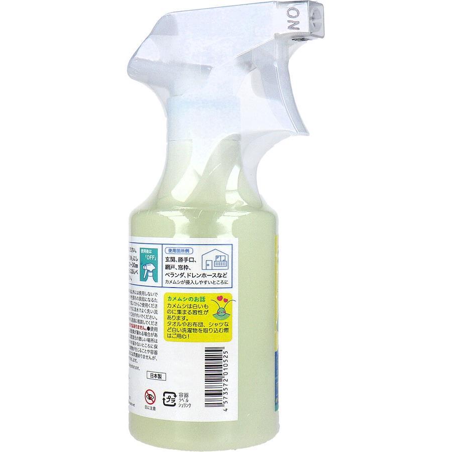 【注意事項】・飲み物ではありません。・用途以外には使用しないでください。・素材によってはシミや色落ちの原因になるため、あらかじめ目立たない部分で試してからご使用ください。・万一、目に入った場合はすぐに流水でよく洗い流し、飲み込んだ場合はすぐに水で口をすすいでください。異常を感じた場合は本品を持参し医師に相談してください。・本品は忌避剤です。 殺虫剤ではありません。・使用環境やカメムシの種類により忌避効果が薄れる場合があります。・直射日光、高温多湿、温度変化の激しい場所は避け、常温でペットや乳幼児の手の届かないところに保管してください。・成分により沈殿物が生じることや容器が変色することがあります。品質には問題ありませんが、お早めにご使用することをおすすめします。