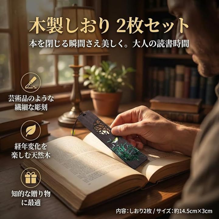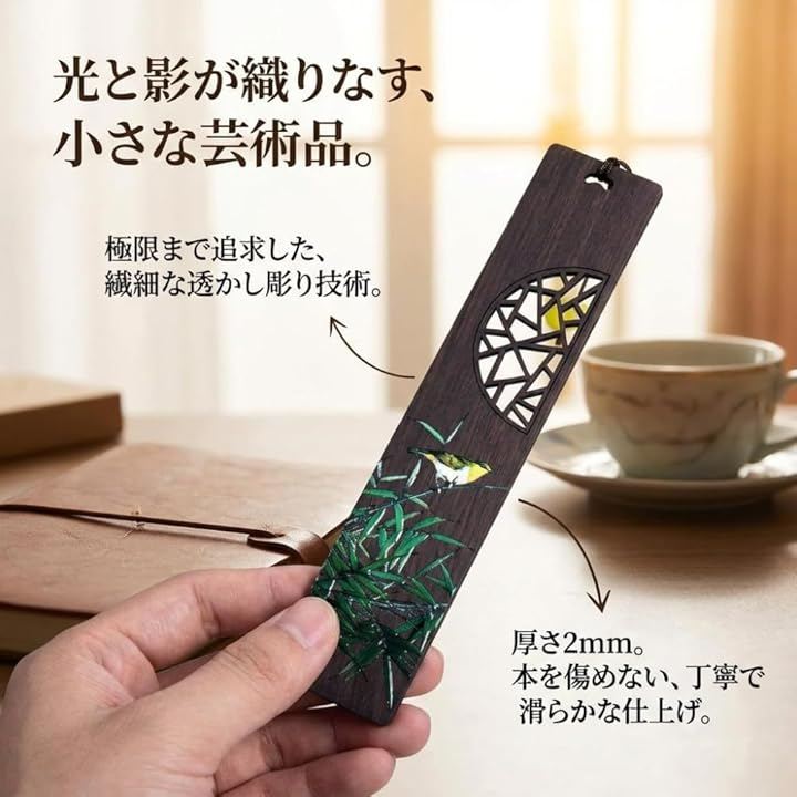 「商品仕様」*セット内容:木製しおりx2枚(竹デザイン・鳥デザイン)、専用ギフトボックス *サイズ:しおり本体/約14.5cmx3cmx厚さ0.2cm、箱/約18cmx12cmx2cm *素材:天然木 *天然素材を使用しているため、木目や色味には個体差がございます。