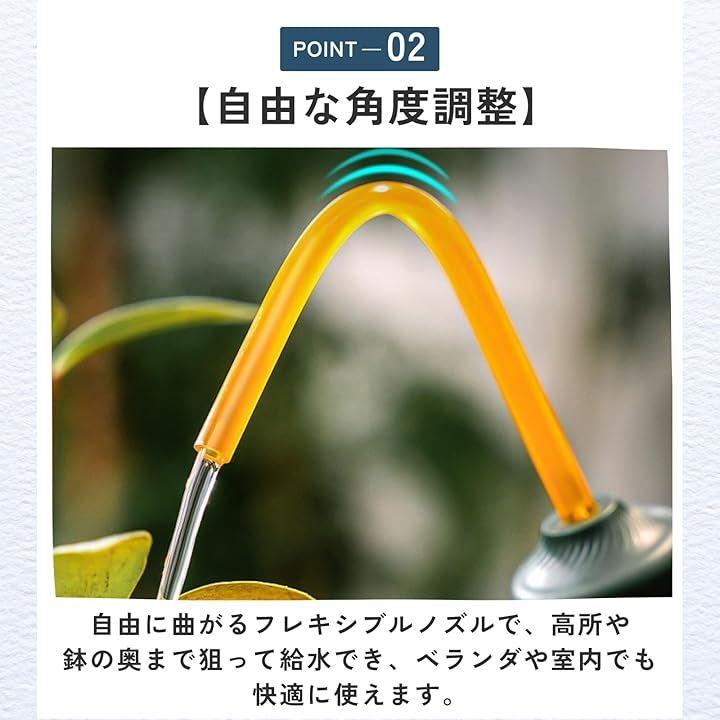 「自由な角度調整」自由に曲がるフレキシブルノズルで、高所や鉢の奥まで狙って給水でき、ベランダや室内でも快適に使えます。