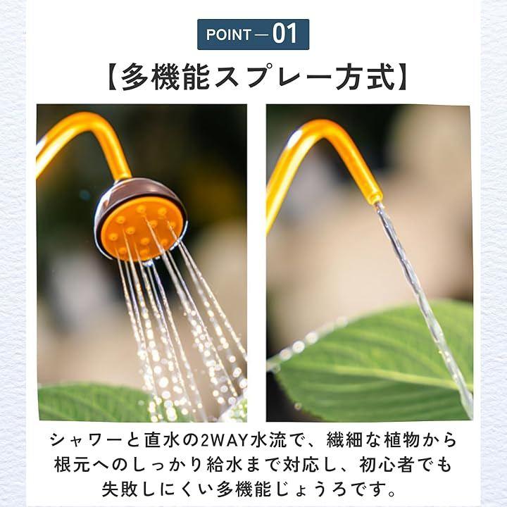 「多機能スプレー方式」シャワーと直水の2WAY水流で、繊細な植物から根元へのしっかり給水まで対応し、初心者でも失敗しにくい多機能じょうろです。
