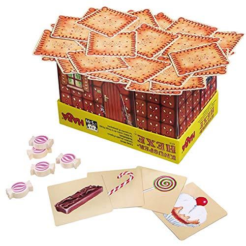 『お菓子の魔女』は、カードだけで立体的に作られた「お菓子の家」の屋根から、お菓子カードを1枚ずつ引き抜いたり、絵柄に応じて差し戻したりしながら、たくさん集めてご褒美のキャンディコマをもらうゲームです。童話で有名な「お菓子の家」の屋根から少しずつお菓子をいただいちゃいましょう。 でも、魔女が目覚めないように気をつけて! ◇ 1人ずつ代わりばんこに、屋根に重なっているお菓子カードを1枚選んで引き抜いては、表側に描かれているお菓子を確認して自分の手元に重ねていきます。 ◇ でも、もし、1周前に自分が重ねたのと同じ種類のお菓子を取ってしまったら、屋根に戻さなければなりません。 ただし、「そのお菓子なら欲しい」他の人がそのカードを貰っていくでしょう。 崩さないように、ぎりぎりのところに押し込もうとするのですが、屋根の支え具合がその押し込みによっても微妙に変化していきます。 ◇ こうしてゲームを続けていき、支えきれずに屋根が崩れてしまったら、いちばんお菓子カードを多く集めた人がごほうびのキャンディコマをもらって1ラウンド終了です。カードを集めてまた屋根を作って…と繰り返していき、キャンディコマを先に2個もらった人が勝ちです。 メーカー: すごろくや (日本), 発行年: 2019年(原版ドイツ2009年) 国内版発売元: すごろくや, 国内版発行年: 2019年 作者: Heinz Meister(ハインツ・マイスター, 代表作: 『スティッキー』『デジャブ』など多数) 5才~大人, 2~4人用, 所要15分, ルール難度:★ (1)
