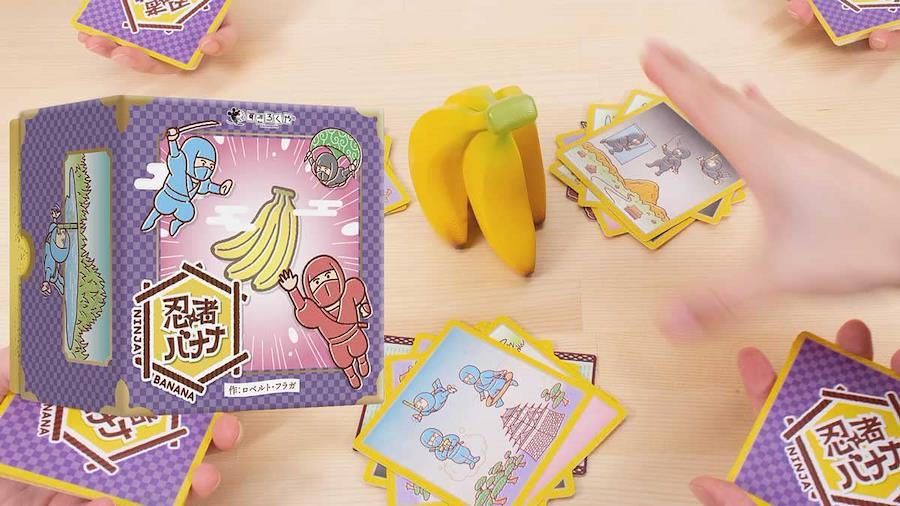 『忍者バナナ』は、場の3ヶ所に次々と重ねられていく忍者カードのイラスト要素をよく見て、3枚に共通する「黒い忍者」「2人忍者」などを察知し、素早く中央のぷぴーっ!と鳴るバナナを掴み取るゲームです。★ここがおすすめ「誰よりも早くバナナを掴まねば」と、ドキドキしながら共通点が揃ったり消えたりするのを注視するのが楽しいゲームです。バナナを掴むと、「ぷぴー!」と間の抜けた音がなることで自然と笑いが巻き起こります。忍者の人数や大きさ、背景、色といった4つの要素をすべてを注視することはとても難しく、1つか2つの要素に絞って集中していると、気にしていなかった他の要素でライバルに取られてしまったり、勇み足で間違えてしまったりと予想外のドラマが起こります。また、めくったカードを重ねる時、自分だけが気づいている要素を狙ったり、あえて揃いそうな要素を隠したり、好きな台座を選べることで駆け引きが生まれるのもポイントです。短時間で気軽に大人から子供まで幅広い年齢で楽しめるゲームとしておすすめです。【製品情報】メーカー :すごろくや(日本)初版発行年 :2022年販売元 :すごろくや(日本)国内版発行年 :2022年12月箱サイズ :120 × 120 × 90mm内容物 :忍者カード 81枚, 台座 3枚, バナナ 1個, 説明書(日、英)説明書言語 :日本語, 英語製造国 :中国
