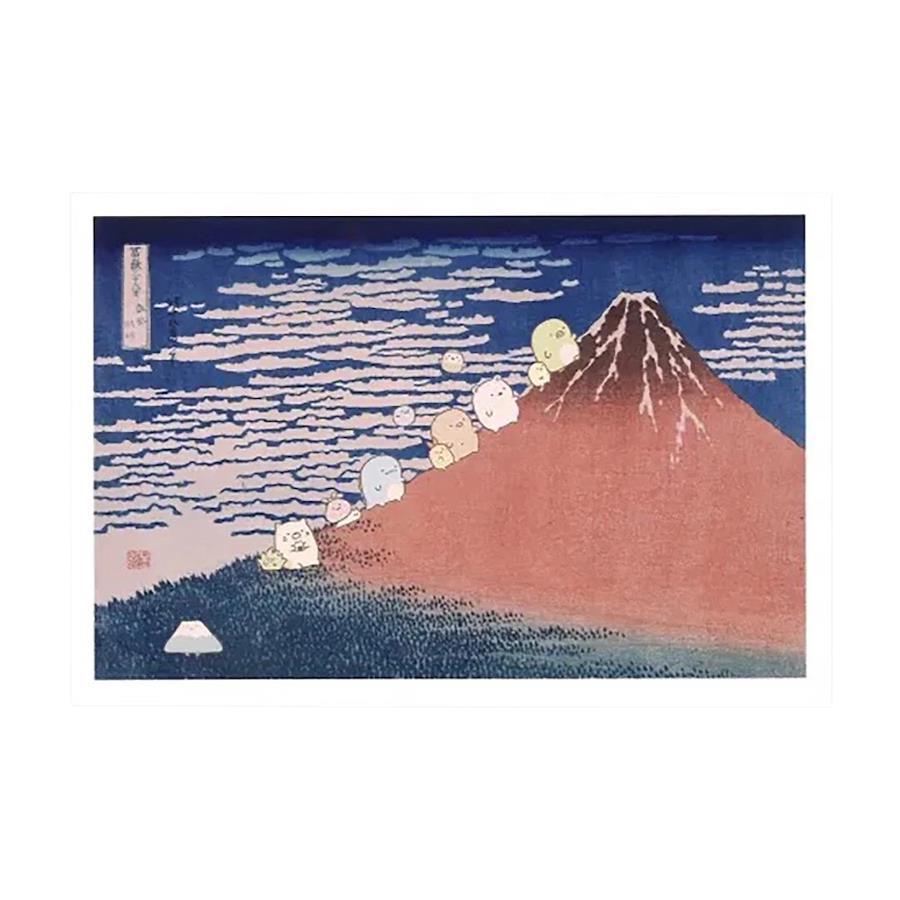 「すみっコぐらし」と、浮世絵の巨匠・葛飾北斎による「富嶽三十六景」の傑作「凱風快晴(がいふうかいせい)」が融合したアートコレクションのポストカードです。赤富士の力強い色彩の中に、すみっコたちがこっそりと顔を出し、伝統美と現代の癒やしが調和した魅力的なデザインです。