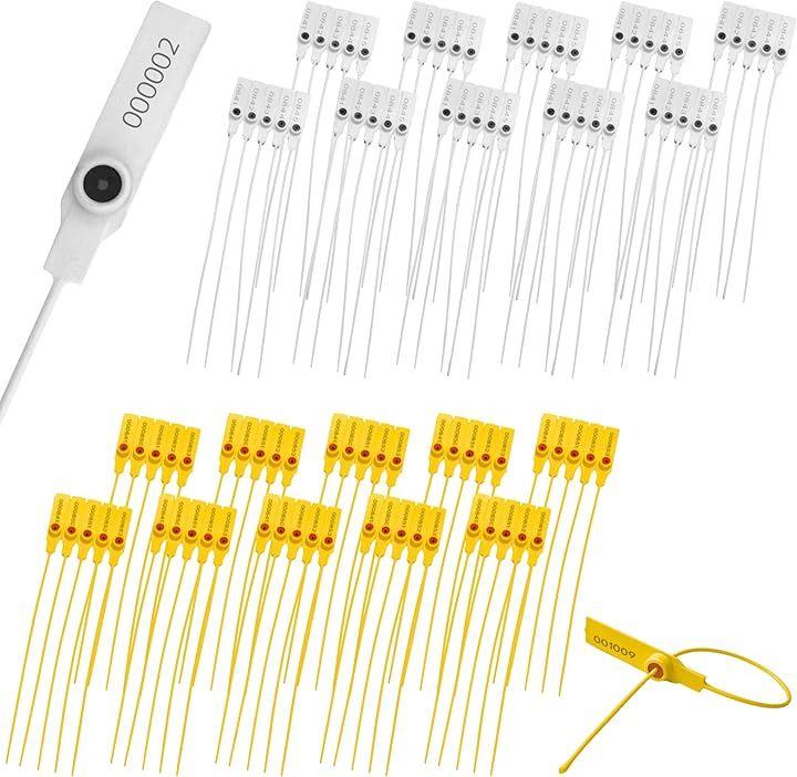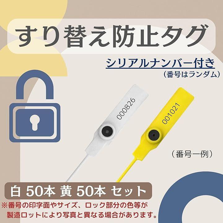 「商品仕様」全長:約275mm,幅:約15mm,ループ部分:約215mm,素材:PP、PE、スチール製ロックシリンダー,セット数:赤x50本、黄x50本(計100本)
