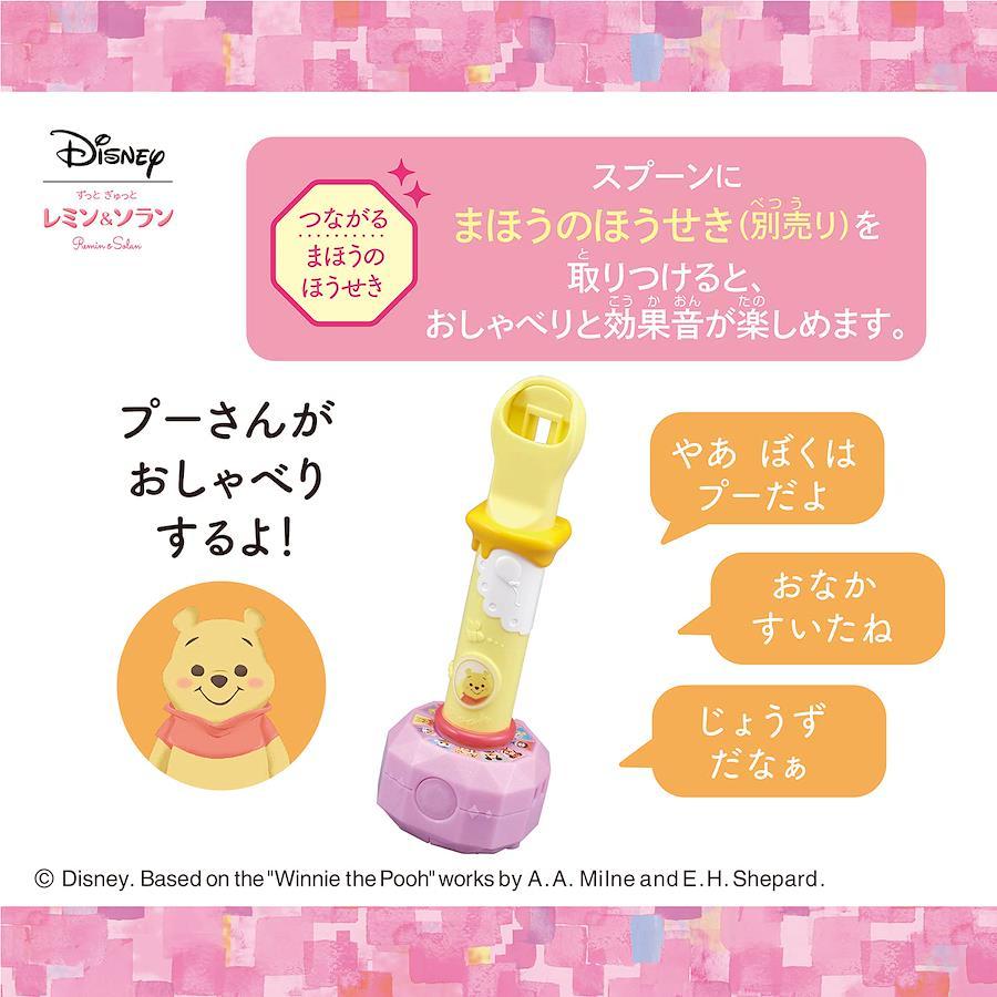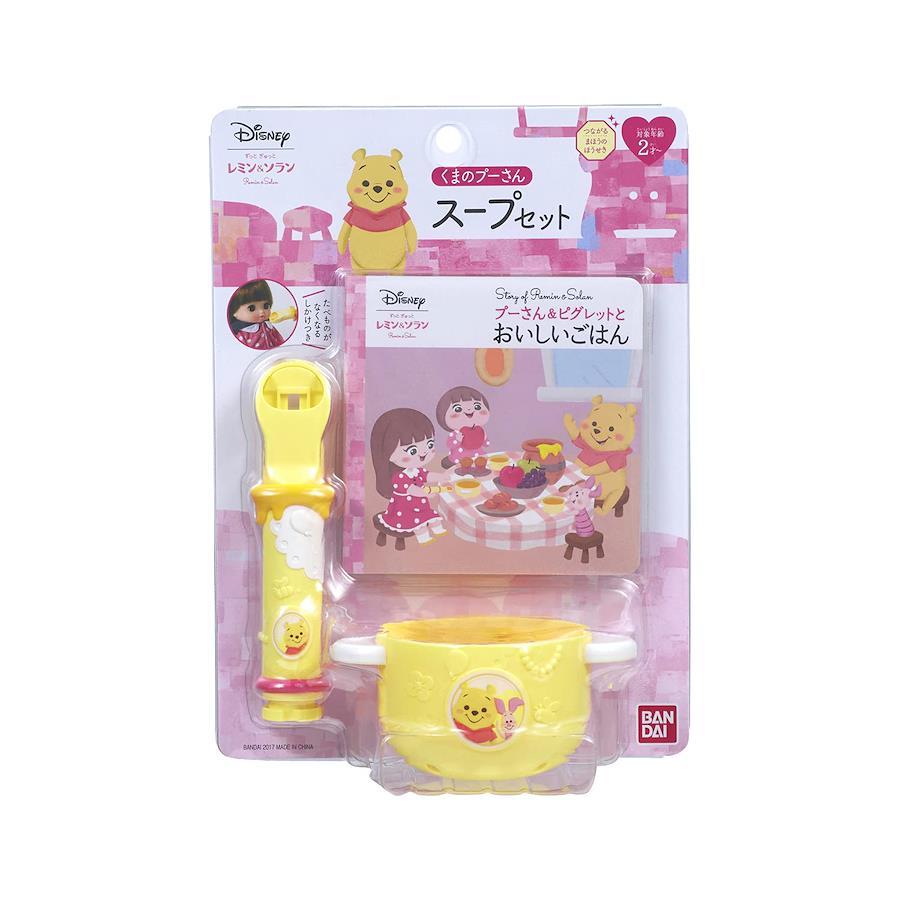 ディズニーとバンダイの共同製作で生まれた、新たなお世話人形、「ずっと ぎゅっと レミン&ソラン」より、くまのプーさん スープセットが登場!!くまのプーさんのスプーンとスープで、ごはん遊びが楽しめる。スプーンはスープがなくなる楽しいしかけ付き。プーさんとピグレットとスープセットが登場する絵本つき。【セット内容】スープ 1個、スプーン 1個、絵本(プーさん&ピグレットとおいしいごはん) 1冊