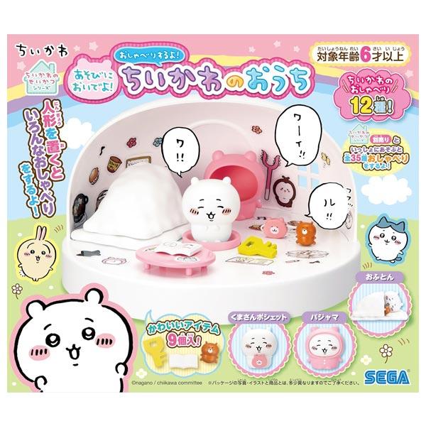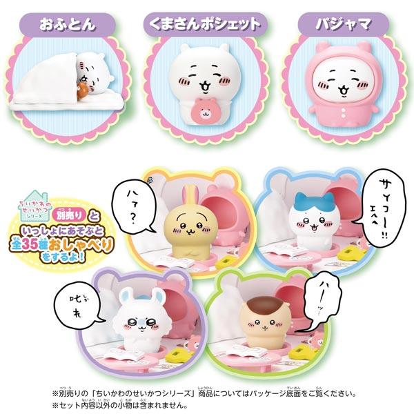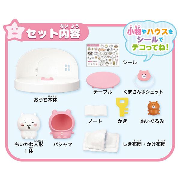 【セット内容】おうち本体×1、ちいかわ人形×1、パジャマ×1、シール×1、テーブル×1、くまさんポシェット×1、ノート×1、かぎ×1、ぬいぐるみ×1、しき布団・かけ布団×1
