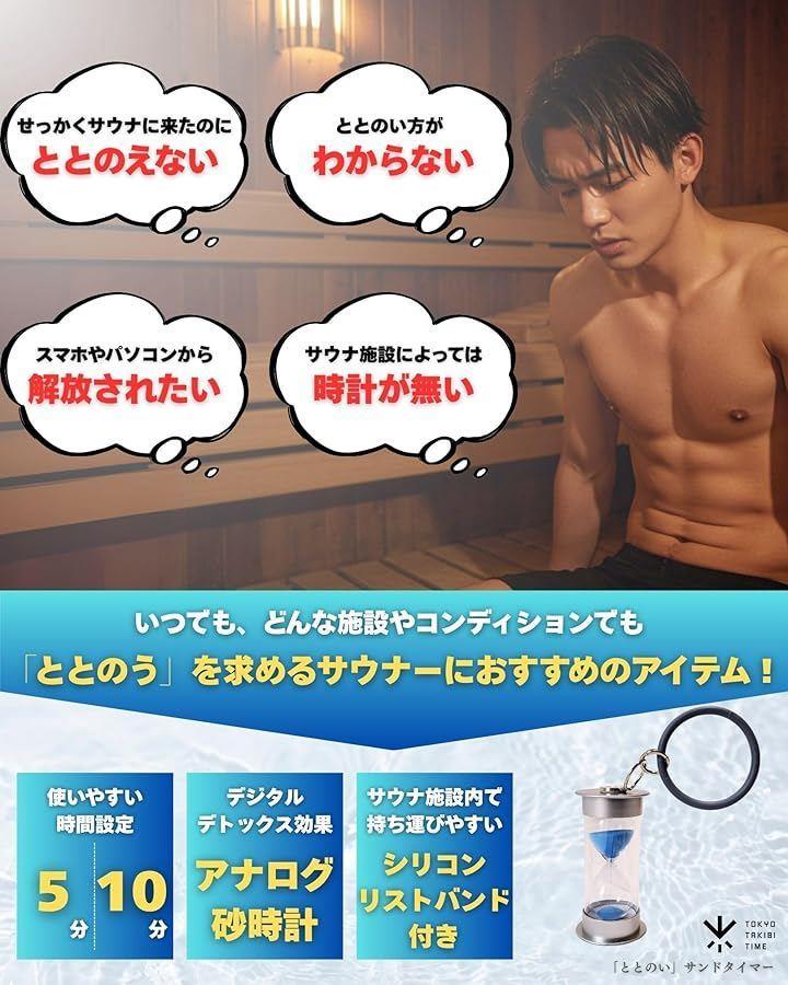 「こんなサウナの悩みありませんか?」 「せっかくサウナに来たのにととのえない…」「ととのい方がわからない…」 「スマホやパソコンから解放されたい…」「サウナ室に時計がない…」「目が悪くて時計が見えない…」そんなお悩みをととのいサンドタイマーが解決します。