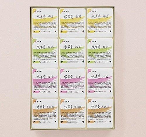水羊羹「御膳(こし餡)」「小倉」「抹茶」「黒砂糖」各3点を詰め合わせました。