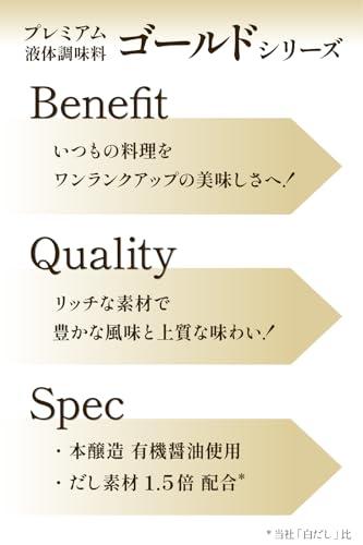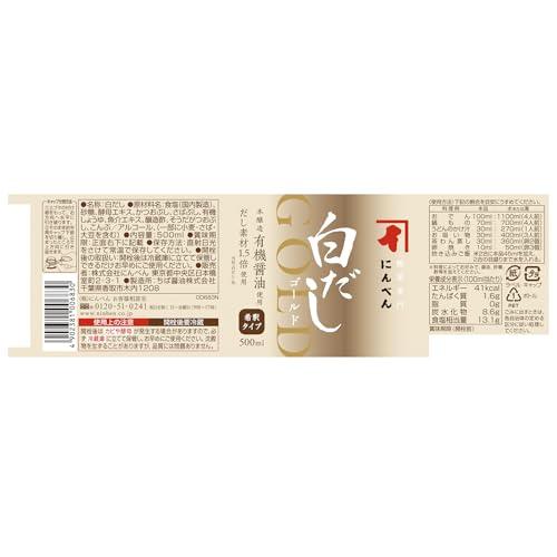 【淡色で上品な風味の白だし】白だしゴールドは香り高く味わい豊かに、だしの風味にさらに磨きをかけました。 淡色仕上げの上品な風味の白だしです。【高品質な厳選素材を使用】有機JAS認定本醸造有機醤油、国内製造鰹節、さば節、宗田鰹節、北海道産昆布の合わせだしを使い、仕上げました。 だし素材は、当社「白だし」の1.5倍使用しています。【内容量】500mL×3本【商品サイズ1本あたり(高さx奥行x幅)】194mmx72mmx72mm【原材料】食塩(国内製造)、砂糖、酵母エキス、かつおぶし、さばぶし、有機しょうゆ、魚介エキス、醸造酢、そうだがつおぶし、こんぶ/アルコール、(一部に小麦・さば・大豆を含む)【重要】メーカーによる商品リニューアルに伴いパッケージ(内容量も含む)変更が行われた場合、新パッケージでお届け致します事ご了承願います。