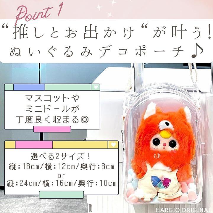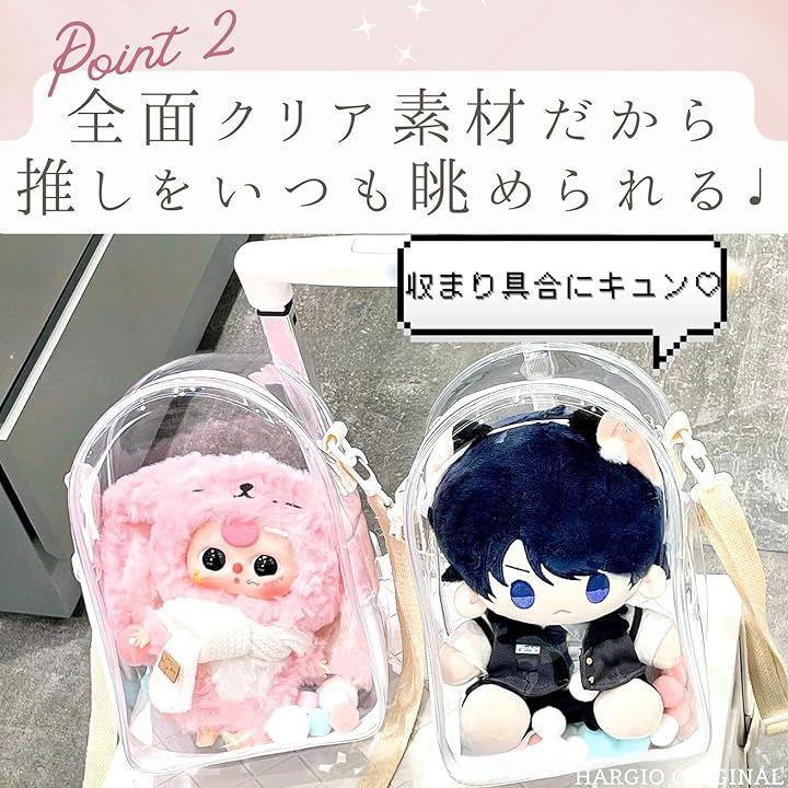 シンプルで可愛いデザインが魅力のぬいポーチ.大き目サイズの全面透明でぬいぐるみが映え、推しキャラとお出かけができるバッグです。