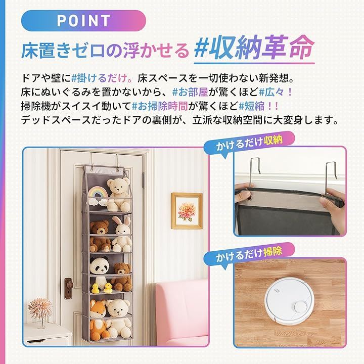 ぬいぐるみ、洗面所でタオルや化粧品、玄関でマスクやキーリングでリモコンや文房具など、これ1つで大量収納