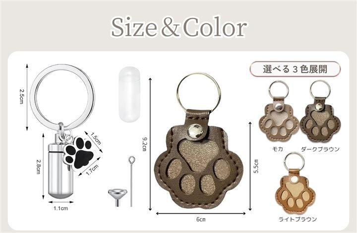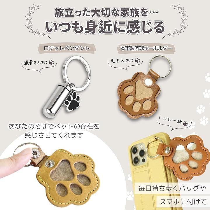 革製の遺毛キーホルダーと、防水仕様の遺骨アクセサリー(ロケットペンダント)が、あなたのそばでペットの存在を感じさせてくれます。