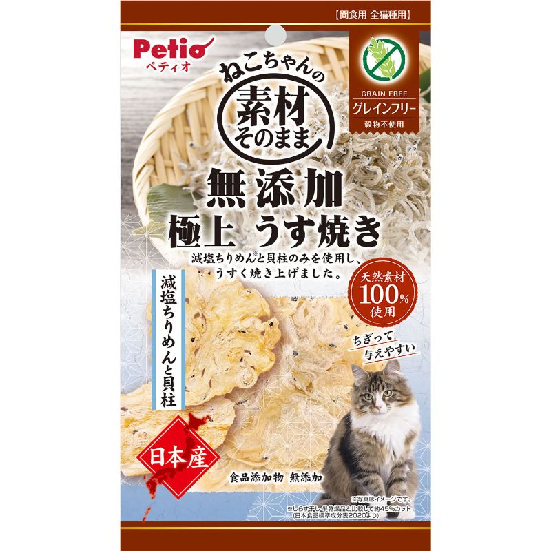 ・減塩ちりめんと貝柱のみを使用し、うすく焼き上げました。・穀物不使用なので、穀物アレルギーのねこちゃんにも安心して与えられます。・減塩タイプのちりめんとタウリン豊富な貝柱を贅沢に使用しました。・小さくちぎって与えやすいやわらか仕上げです。・天然素材100%使用。食品添加物無添加。