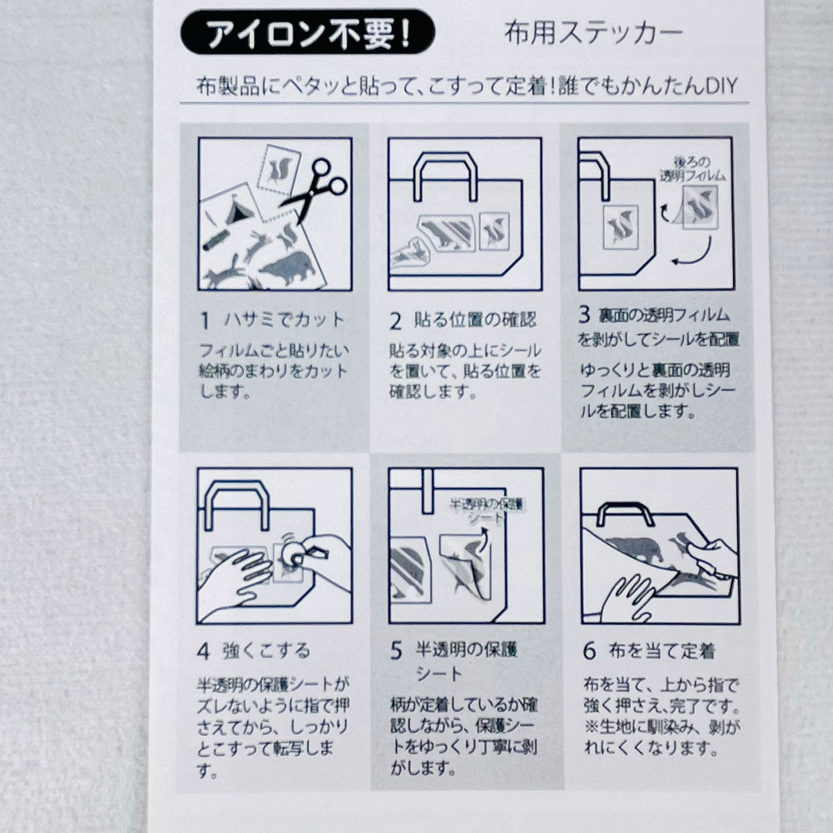 アイロンを使わずに様々な生地にシールを貼り付けることができる布用転写シールです。
