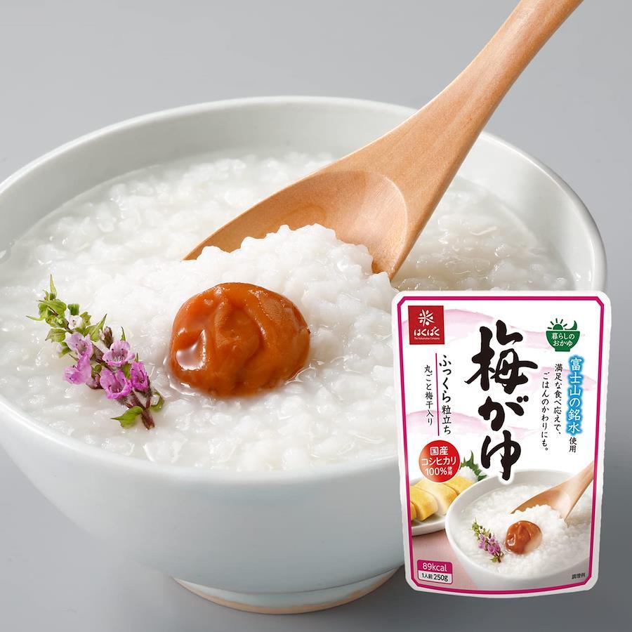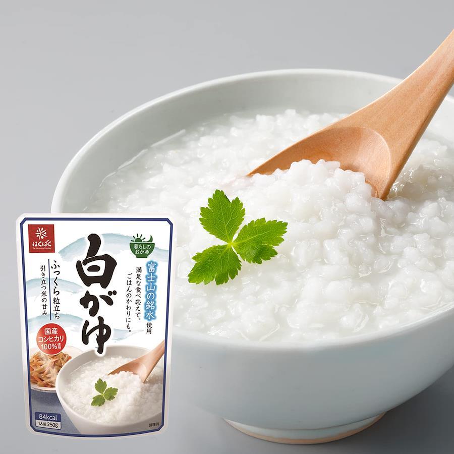 【白がゆ】うるち米(国産)【梅がゆ】うるち米(国産)、梅干【玉子がゆ】鶏卵(国産)、うるち米(国産)、かつお節エキス、しょうゆ(小麦、大豆を含む)、食塩、酵母エキスパウダー、砂糖/増粘剤(加工でん粉)、酸味料【紅鮭がゆ】うるち米(国産)、紅鮭フレーク、こんぶだし、食塩/調味料(アミノ酸)