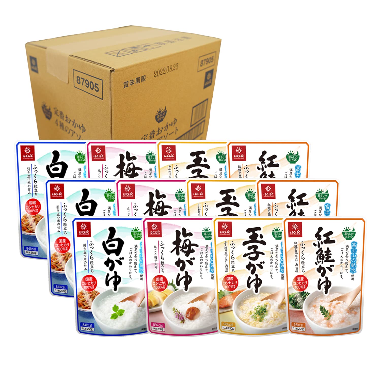 穀物の素材が持つ健康感で体にやさしい日常のおかゆです。国産こしひかり100%・富士山の銘水を使用した、ふっくら粒立ちが特徴なので、日々の主食の代わりとしてもご利用いただけます。忙しいときの簡単ごはんや、気になる毎日のカロリーを抑えるためにも活躍できる商品です。白がゆ、梅がゆ、玉子がゆ、紅鮭がゆが入ったアソートセットです。