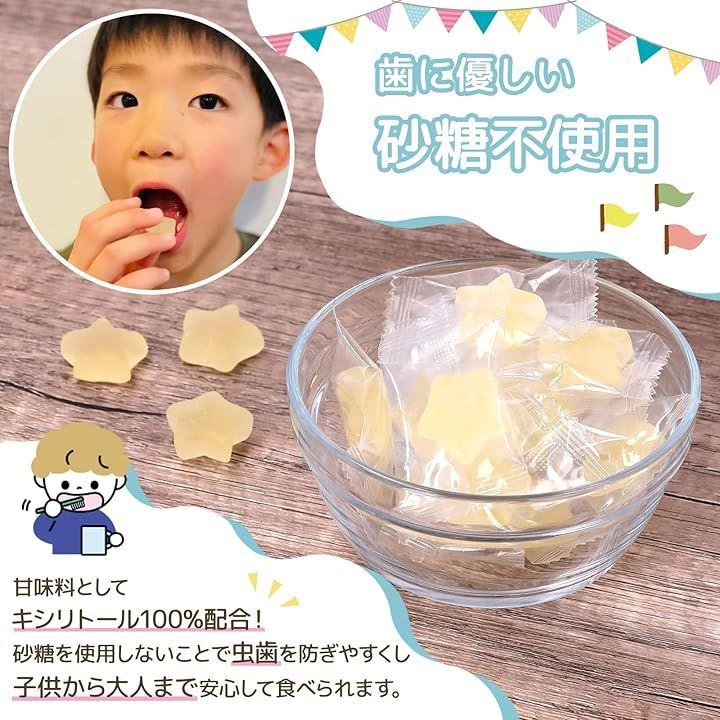 甘味料としてキシリトール100%配合。砂糖不使用なので虫歯になりにくいため、子どもから大人まで安心して食べられます。
