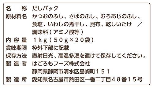 原材料:かつおのふし、さばのふし、むろあじのふし、食塩、いわしの煮干し、昆布、乾しいたけ、調味料(アミノ酸等)商品サイズ(高さx奥行x幅):40.0mmx345.0mmx280.0mm内容量:50g×20袋かつお節をベースに、さば節、むろあじ節、いわし煮干しなどをブレンドしているため、素材の旨味を活かした上品なだしがとれます。吸物、みそ汁、煮物、天つゆ、茶碗蒸し、そば・うどんのつけつゆ、かけつゆなどの料理でご使用ください。【重要】メーカーによる商品リニューアルに伴いパッケージ(内容量も含む)変更が行われた場合、新パッケージでお届け致します事ご了承願います。