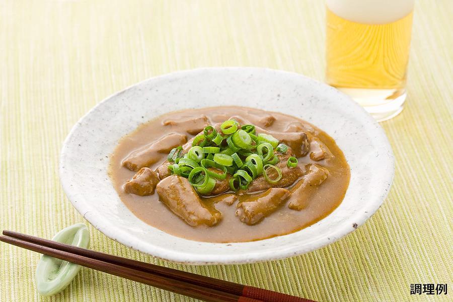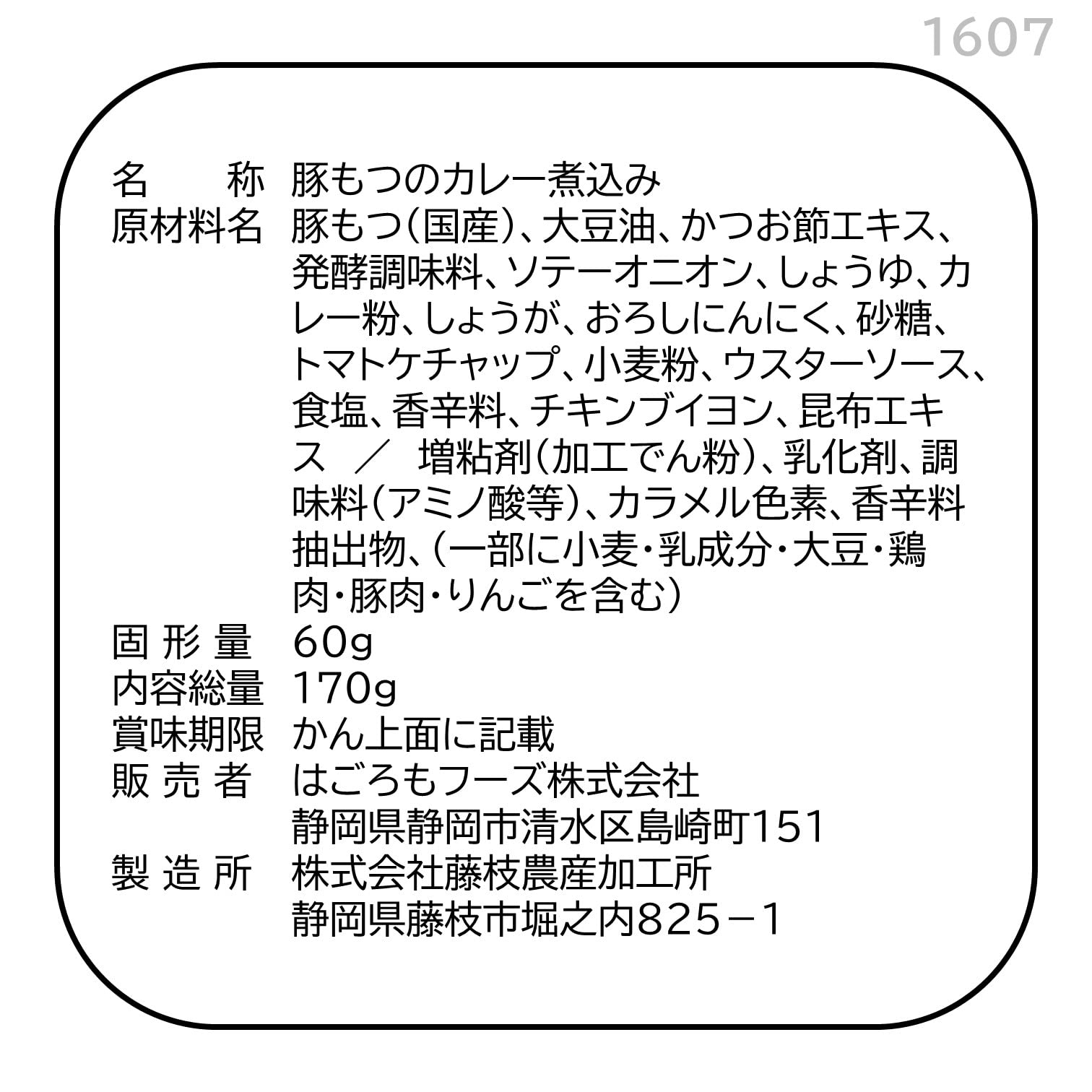 原材料:豚もつ(国産)、大豆油、かつお節エキス、発酵調味料、ソテーオニオン、しょうゆ、カレー粉、しょうが、おろしにんにく、砂糖、トマトケチャップ、小麦粉、ウスターソース、食塩、香辛料、チキンブイヨン、昆布エキス / 増粘剤(加工でん粉)、乳化剤、調味料(アミノ酸等)、カラメル色素、香辛料抽出物、(一部に小麦・乳成分・大豆・鶏肉・豚肉・りんごを含む)
