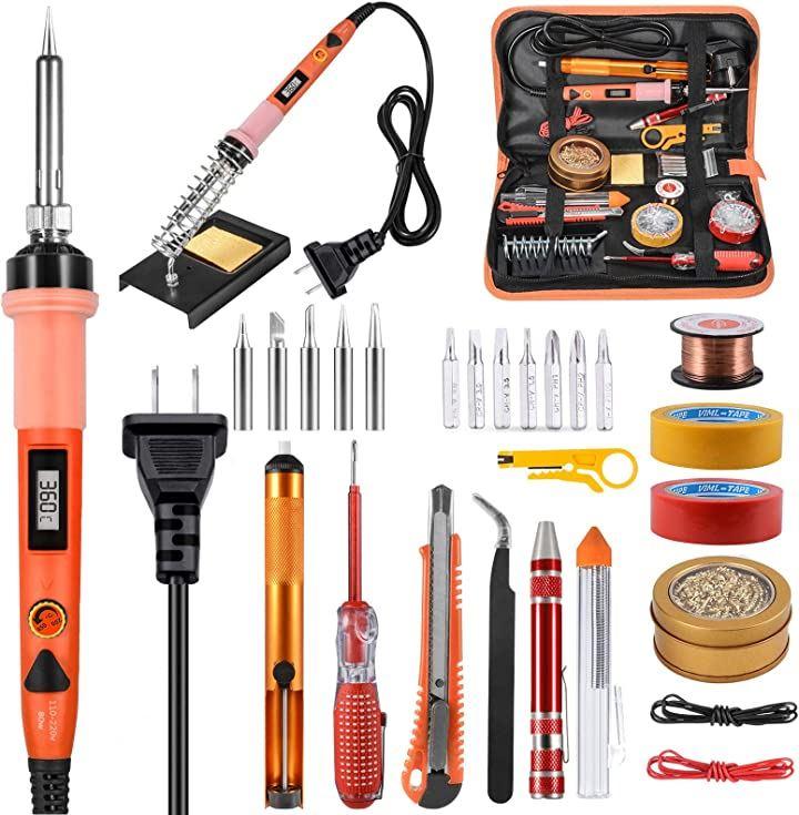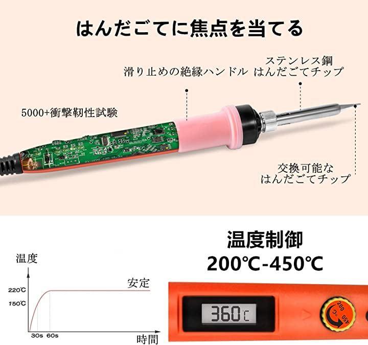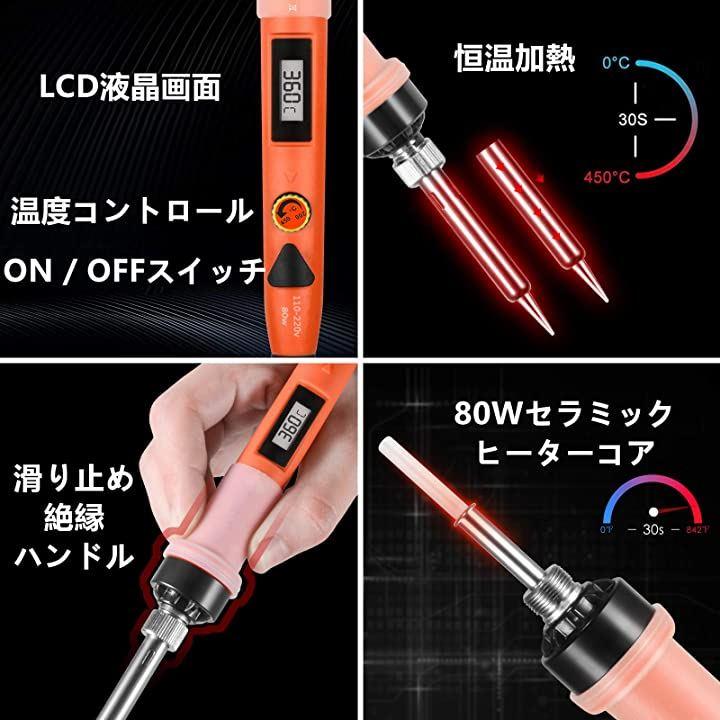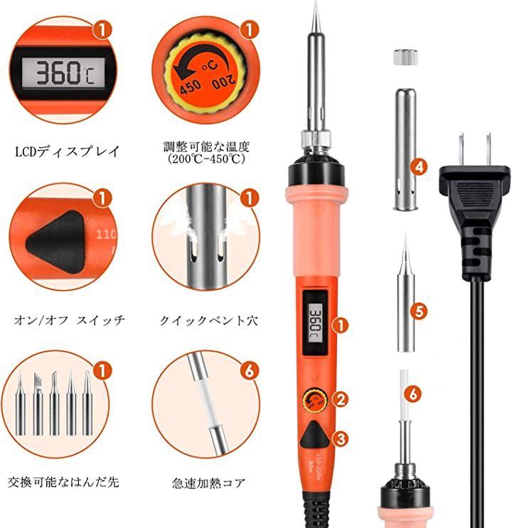 ・「簡単な温度調節」80Wはんだごてセット、液晶ディスプレイ、つまみ付き温度調節(200℃~450℃)。