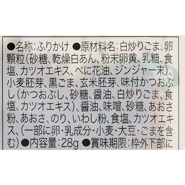 ■原材料名:白炒りごま(国内製造)、卵顆粒(砂糖、乾燥白あん、粉末卵黄(卵を含む)、乳糖、食塩、カツオエキス、植物油脂、ジンジャー粉末)、黒炒りごま、小麦胚芽、玄米胚芽、味付かつお節(かつお節、砂糖、醤油(大豆を含む)、ごま、食塩、カツオエキス)、胚芽味噌(小麦胚芽、味噌)、味付アオサ粉(醤油、砂糖、アオサ粉、いわし粉、食塩、カツオエキス)、醤油、アオサ、焼きもみのり