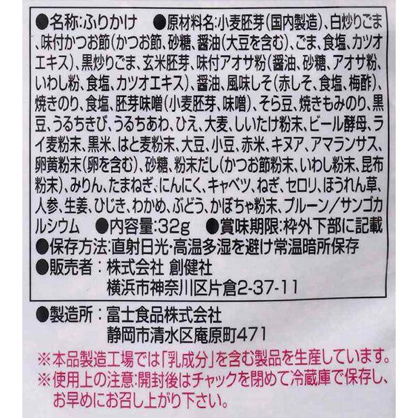 ■原材料名:小麦胚芽(国内製造)、白炒りごま、味付かつお節(かつお節、砂糖、醤油(大豆を含む)、ごま、食塩、カツオエキス)、黒炒りごま、玄米胚芽、味付アオサ粉(醤油、砂糖、アオサ粉、いわし粉、食塩、カツオエキス)、醤油、風味しそ(赤しそ、食塩、梅酢)、焼きのり、食塩、胚芽味噌(小麦胚芽、味噌)、そら豆、焼きもみのり、黒豆、うるちきび、うるちあわ、ひえ、大麦、しいたけ粉末、ビール酵母、ライ麦粉末、黒米、はと麦粉末、大豆、小豆、赤米、キヌア、アマランサス、卵黄粉末(卵を含む)、砂糖、粉末だし(かつお節粉末、いわし粉末、昆布粉末)、みりん、たまねぎ、にんにく、キャベツ、ねぎ、セロリ、ほうれん草、人参、生姜、ひじき、わかめ、ぶどう、かぼちゃ粉末、プルーン/サンゴカルシウム