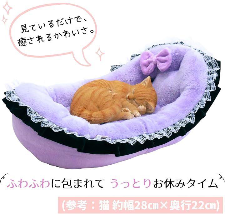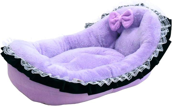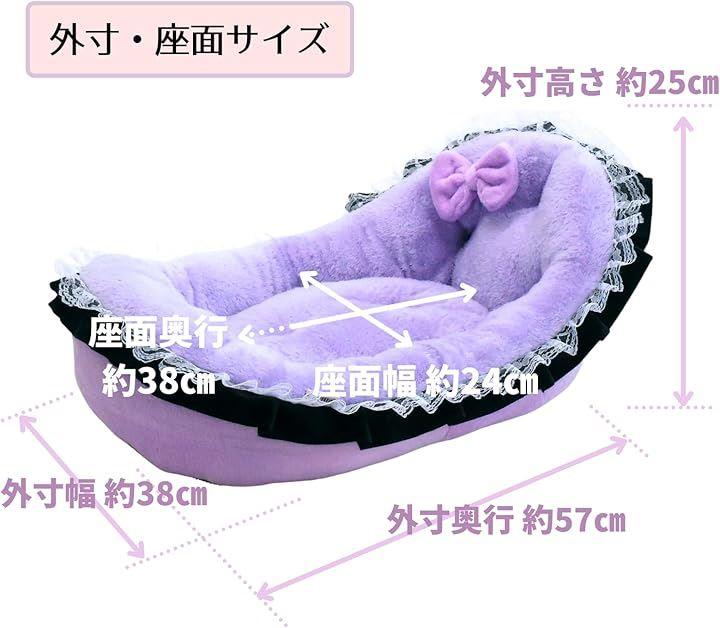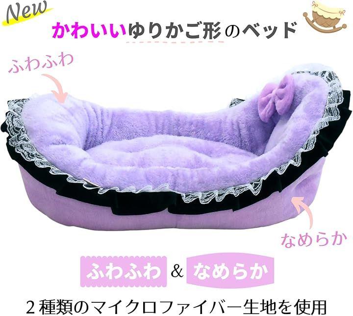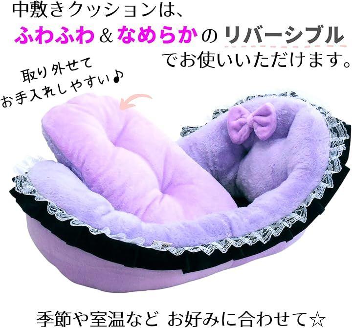 ふわっと柔らかなパステルカラーのゆりかご形ベッドに、リボンやフリル・レースなどをあしらった、とにかくラブリーなペットベッド。
