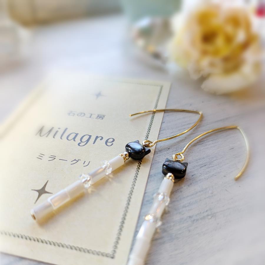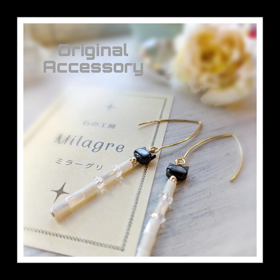 💎黒猫・淡水パールPierce💎金具 Stainless(Gold)Vシェイプ天然石(淡水パール・シェル)Size 8cm/9g