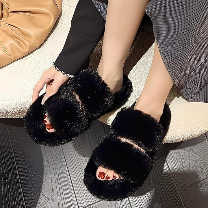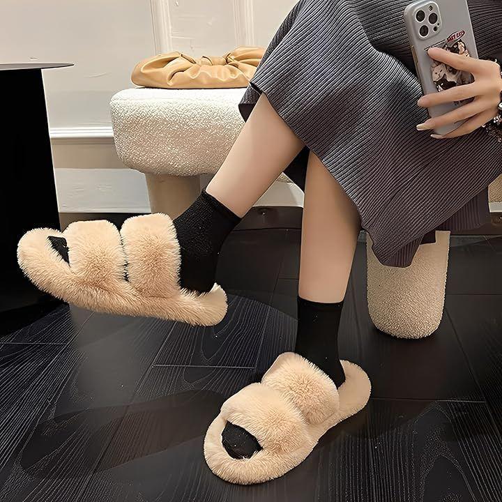 ボリュームたっぷりのふわふわフェイクファーに肌に優しい柔らかい履き心地。