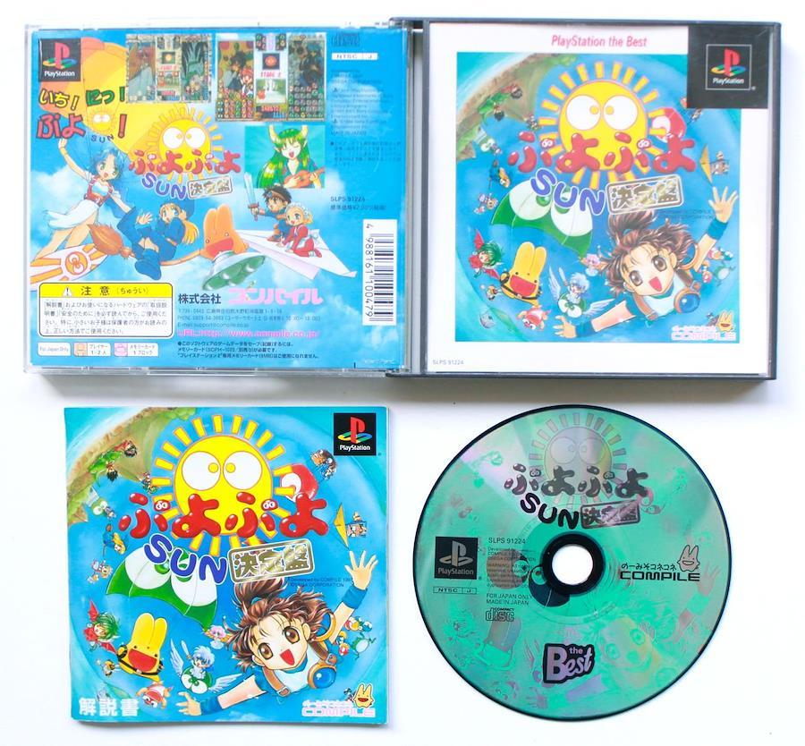 1997年に発売された定番パズルゲーム『ぷよぷよSUN決定盤』が、低価格になって再登場した。本作の特徴は、なんといっても「太陽ぷよ」が導入されたこと。「ぷよ」を4つくっつけて消すと、相手に「おじゃまぷよ」を送れるが、自分と相手が同時に消しあう「相殺」が起きると、双方に「太陽ぷよ」が降ってくる。「ぷよ」を「太陽ぷよ」と一緒に消すと、相手に送る「おじゃまぷよ」が増やせるので、よりたくさんの「太陽ぷよ」を消せば、「大連鎖」よりも強力な攻撃が可能になる。また、本作には多彩なモードを搭載。「連鎖」「大連鎖」の技を練習するなら「とことんなぞぷよ」で練習しよう。このほか、好きなキャラクターを選んでトーナメント大会に参加する「かちぬきぷよぷよ」、アルル・ドラコ・シェゾを主人公にしたストーリーモードの「ひとりでぷよぷよ」、2人対戦の「ふたりでぷよぷよ」、ゲームオーバーまで遊べる「とことんぷよぷよ」と、1人でも2人でも楽しめるようになっている。(田中あきら)
