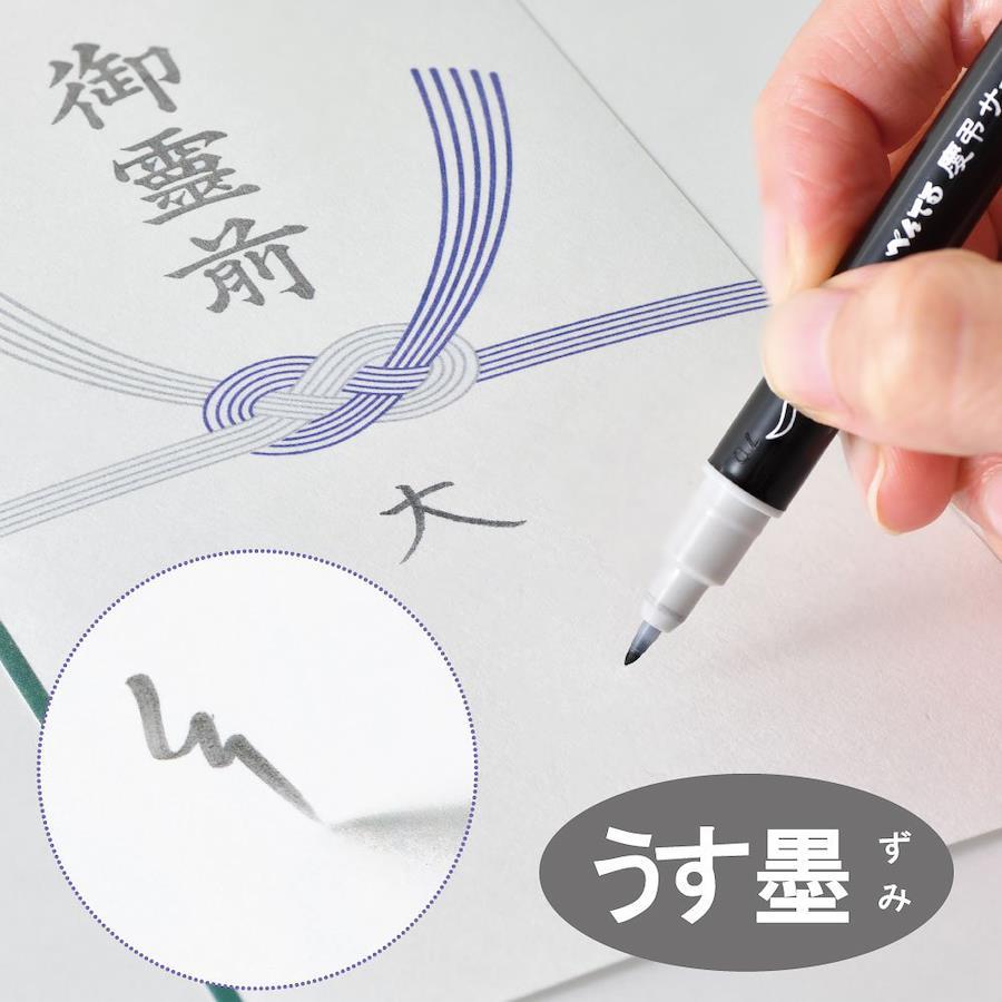 おくやみもお祝い、どちらにも利用できます。香典袋の「うす墨色」、祝儀袋の「墨色」が1本でまかなえる筆ペン。書いた文字がにじみにくい顔料インキを使用。ペン先は筆に不慣れな方でも簡単に使える、しっかりとしたサインペンタイプのペン先。