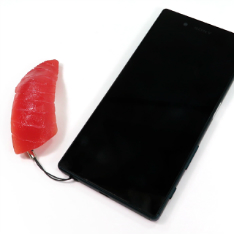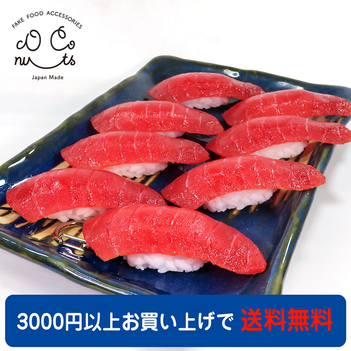 本物のまぐろにぎり寿司そっくりに作られた食品サンプルのアクセサリーです。スジは線を引いただけではなく、ちゃんとスジのパーツが中に入っています。こだわりの製法でここまでリアルになりました。