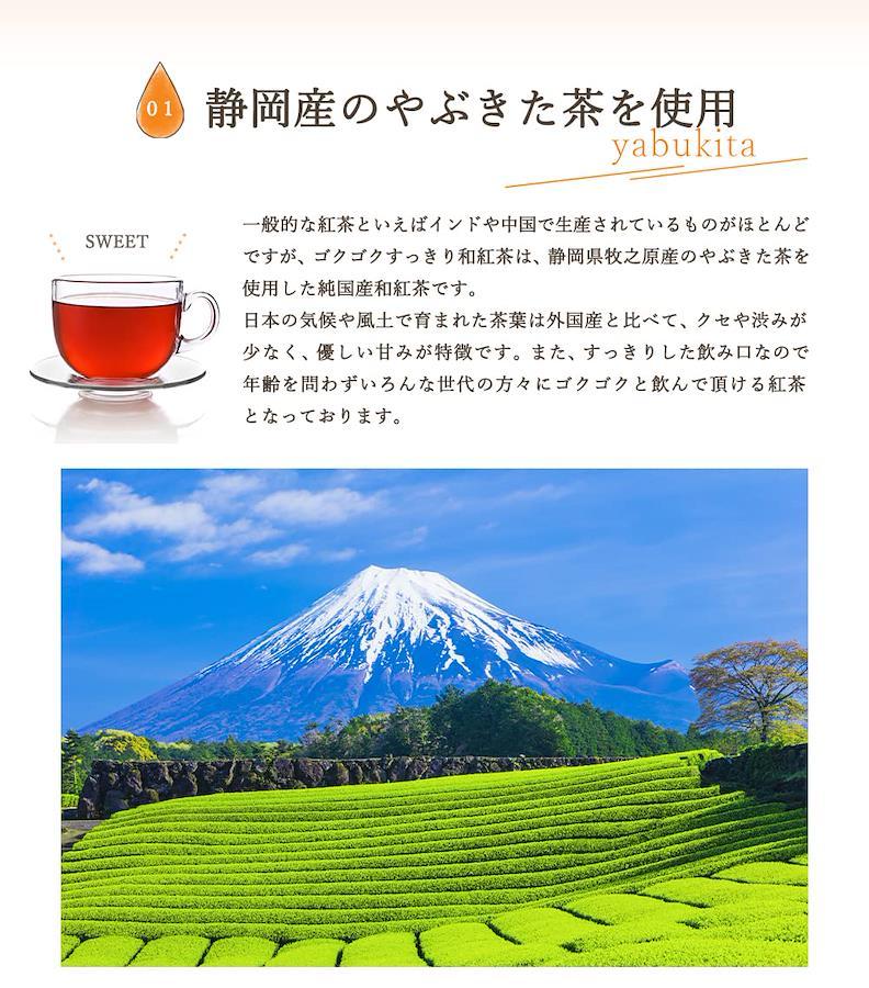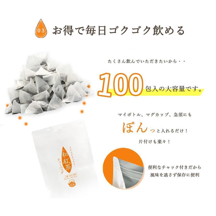 内容量: 2g×100pの大容量!?形状:ティーバッグ 三角テトラ構造 無漂白(トウモロコシを原料とした自然由来の素材を使用。)?原材料:紅茶(静岡)?生産地:日本・静岡県?ブランド名:みずたま農園製茶場?特徴:一般的な紅茶といえばインドや中国で生産されているものがほとんどですが、ゴクゴクすっきり和紅茶は、静岡県牧之原産のやぶきた茶を使用した純国産和紅茶です。 日本の気候や風土で育まれた茶葉は外国産と比べてクセや渋みが少なく、優しい甘みが特徴です。また、すっきりとした飲み口なので年齢を問わずいろんな世代の方々にゴクゴクと飲んでいただける紅茶となっております。?推奨:茶 お茶 緑茶 ほうじ茶 ジャスミン茶 ルイボスティー ハーブティー プーアル茶 濃茶 濃い茶 濃い味 玄米茶 烏龍茶 紅茶 無糖茶 水 ミネラルウォーター 天然水や炭酸水などの代わりに和紅茶でホッと一息?保存方法:高温、多湿、直射日光を避け、冷暗所で保存してください。移り香にご注意ください。?【ICE】:マイボトル・水出し ティーバッグ2つを入れお水を約300~500ml注いで60分程待ってからお飲みください。?【HOT】:<マイボトル> ティーバッグ1つを入れお湯を約400ml注いで10分程待ってからお飲みください。濃く飲みたい場合は2つ。<急須・マグカップ> ティーバッグ1つを入れお湯を200~300ml注いで3分程待ってからお飲みください。濃く飲みたい場合は2つ。【免責事項】メーカーによる商品リニューアルに伴いパッケージ(内容量も含む)変更が行われた場合、新パッケージでお届け致します事ご了承願います。