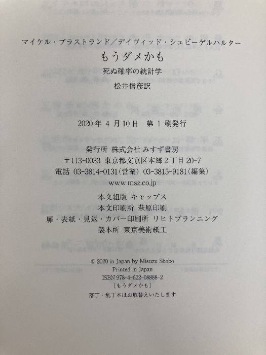 ■商品詳細■ 商品名・もうダメかも――死ぬ確率の統計学 みすず書房 デイヴィッド・シュピーゲルハルター/ ■商品状態■表紙にスレ、ヤケ、天地小口にスレ、ヤケ、シミ、本にスレ、ヨレ、ヤケ、があります。本を読むことに支障はございません。※注意事項※■毎商品チェック後出品しておりますが、中古品ということもあり、多少の書き込み等のチェック漏れがあった際はご容赦下さい。■付録等の付属品がある商品の場合、記載されていない物は『付属なし』とご理解下さい。■併売販売をしているため、在庫切れの場合はキャンセルとなります。予めご了承ください。