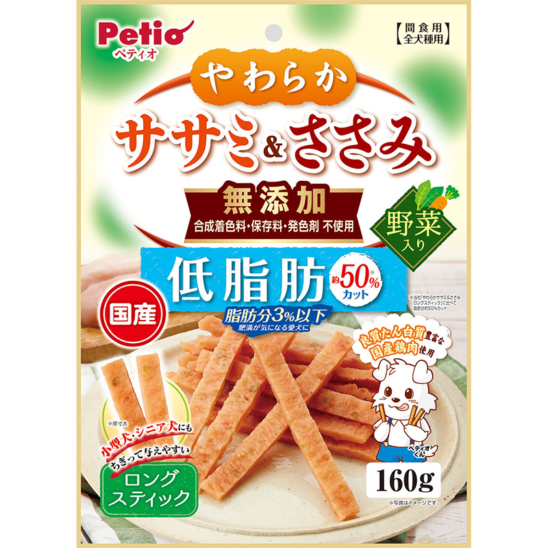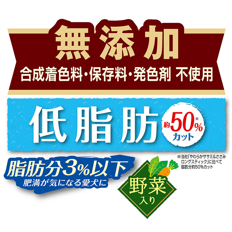 低脂肪・良質たん白質が豊富な鶏ササミを使用。脂肪分を約50%カットした低脂肪タイプ(当社「やわらかササミ&ささみ ロングスティックタイプ」比)だから、肥満が気になるワンちゃんにぴったり。コラーゲン配合で皮膚や被毛、関節の健康を保つ。ちぎってあたえやすい。栄養豊富なほうれん草、にんじん入り。