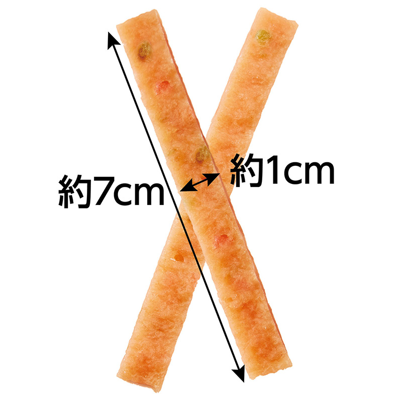【原材料】肉類(鶏ササミ・鶏)、小麦粉、コラーゲン、米粉、たん白加水分解物、食塩、にんじん、ほうれん草、ソルビトール、加工でんぷん、グリセリン、リン酸塩(Na)、炭酸Ca、カゼインNa、着色料(紅麹・クチナシ)【保証成分】たん白質10.5%以上、脂質1.0%以上、粗繊維0.5%以下、灰分3.0%以下、水分30.0%以下【エネルギー】303kcal/100g