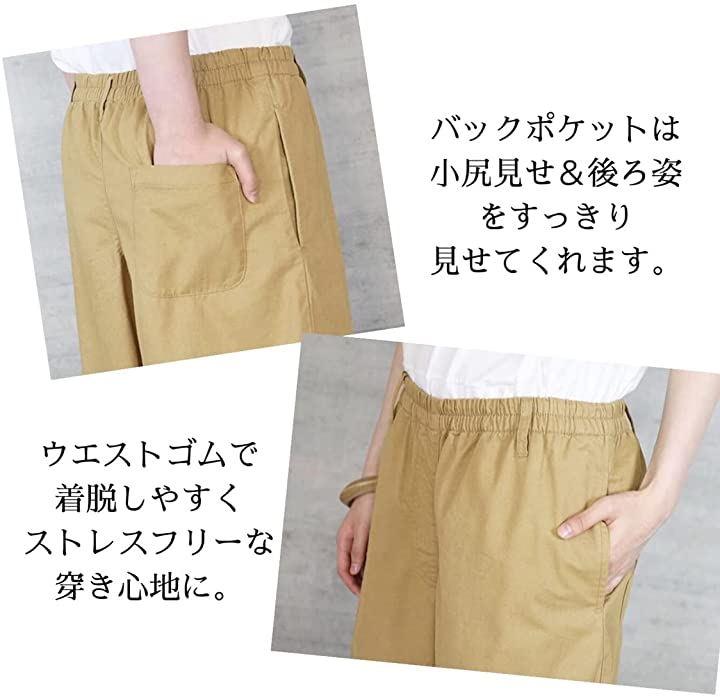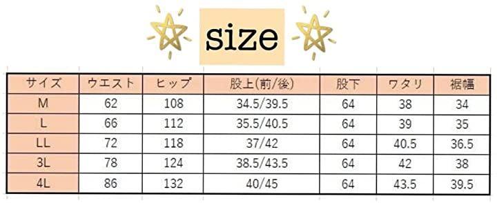 ・・サイズ [Mサイズ]ウエスト:62cm、ヒップ:108cm、股上(前/後):34.5/39.5cm、股下:64cm、ワタリ:38cm、裾幅:34cm [Lサイズ]ウエスト:66cm、ヒップ:112cm、股上(前/後):35.5/40.5cm、股下:64cm、ワタリ:39cm、裾幅:35cm [LLサイズ]ウエスト:72cm、ヒップ:118cm、股上(前/後):37/42cm、股下:64cm、ワタリ:40.5cm、裾幅:36.5cm [3Lサイズ]ウエスト:78cm、ヒップ:124cm、股上(前/後):38.5/43.5cm、股下:64cm、ワタリ:42cm、裾幅:38cm [4Lサイズ]ウエスト:86cm、ヒップ:132cm、股上(前/後):40/45cm、股下:64cm、ワタリ:43.5cm、裾幅:39.5cm
