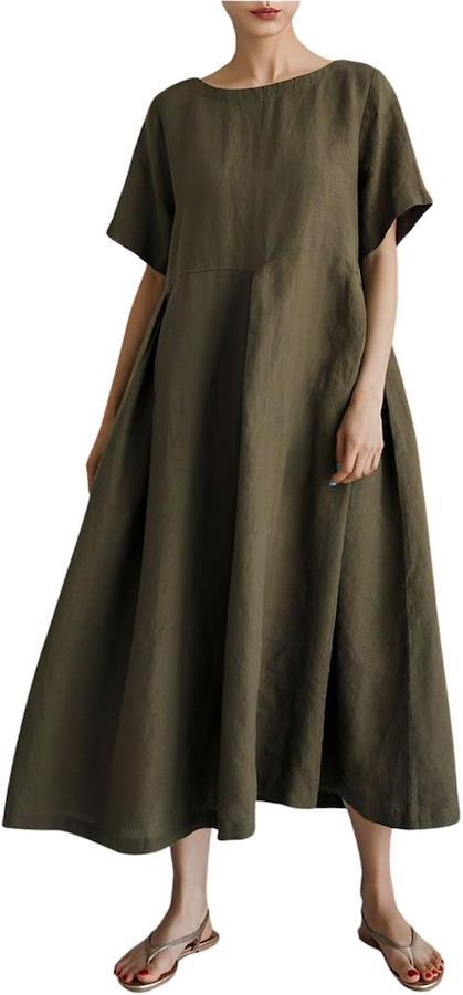 ゆったりとしたシルエットが可愛いナチュラルワンピース 胸下からの切り替えしは大きめタックでふんわりとしたロング丈で体型カバーも叶います 綿麻混合生地なので暑い時期もさらりと涼しく着られます