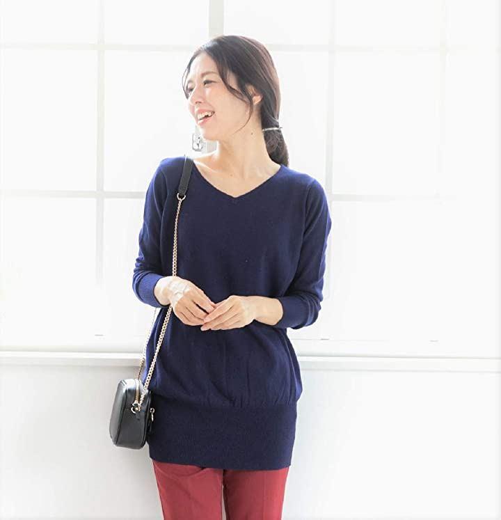 ・無地で程よく開いたVネックニットにはネックレスやブレスレットも映えます*きれいめ秋色カラーとちょっと長めのセミロング丈が、体型カバーしながら女性らしいスタイリングを1ランクUPし、秋冬コーデも簡単に。