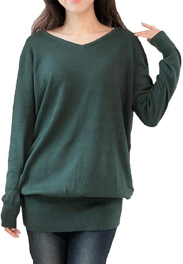 ・無地で程よく開いたVネックニットにはネックレスやブレスレットも映えます・きれいめ秋色カラーとちょっと長めのセミロング丈が、体型カバーしながら女性らしいスタイリングを1ランクUPし、秋冬コーデも簡単に。