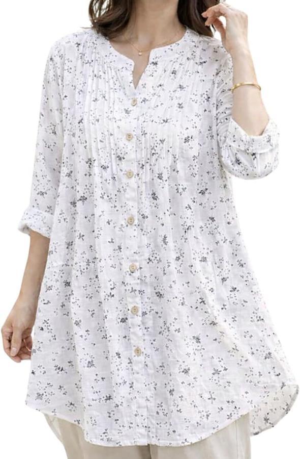 「軽やか花柄チュニック」Aライン花柄のロングシャツワンピース。