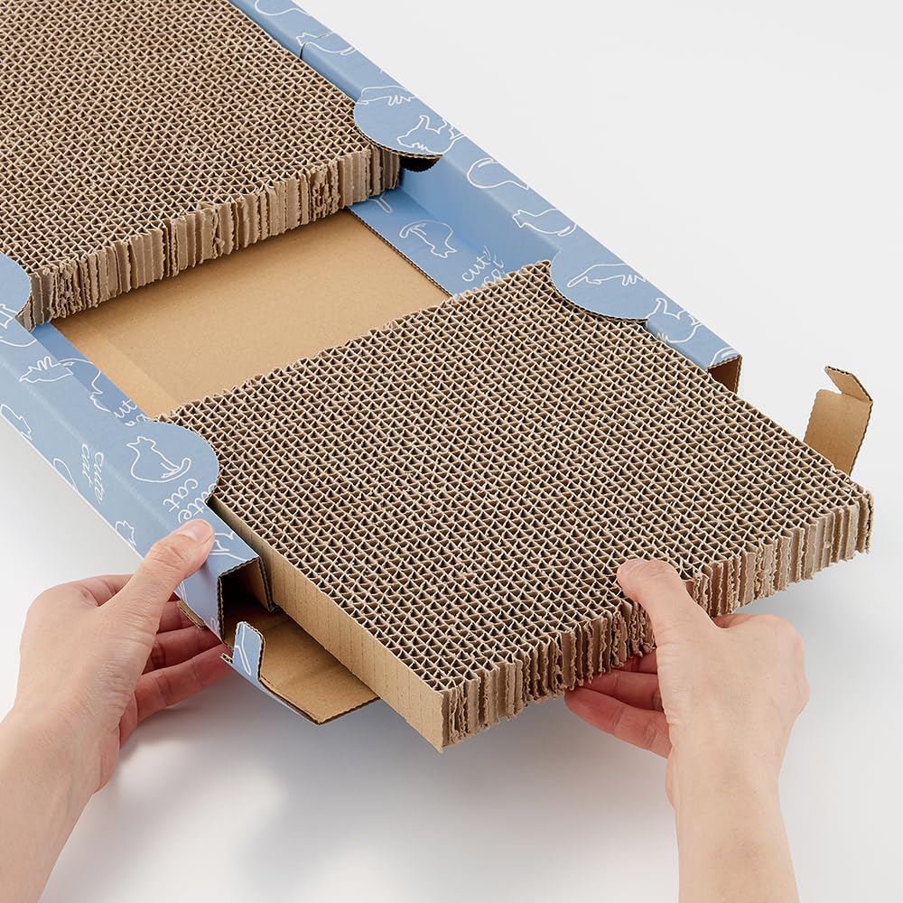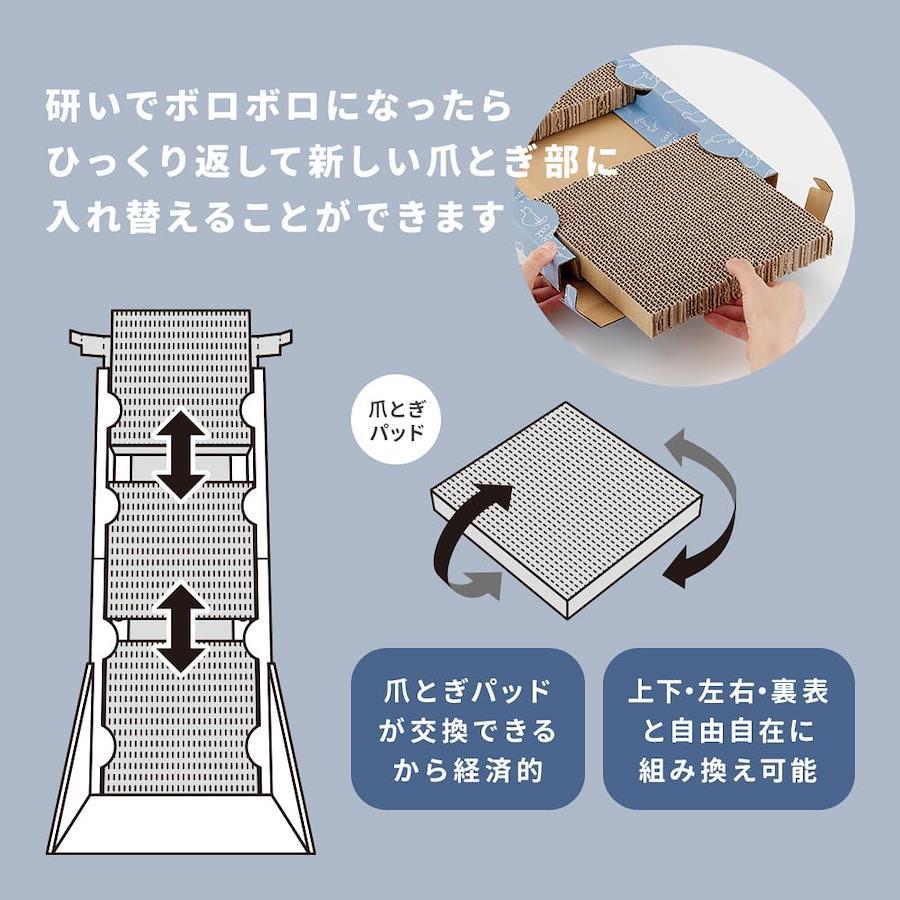 壁ぎわに立てて省スペース!背伸びしながら気持ちよく爪とぎ。研いでボロボロになった爪とぎ部をひっくり返して新しい爪とぎ部に入れ替えできる!爪とぎパッドが交換できて経済的。上下、左右、裏表と自由自在に組み換え可能。国産ダンボール使用で設計から製造まで日本製。