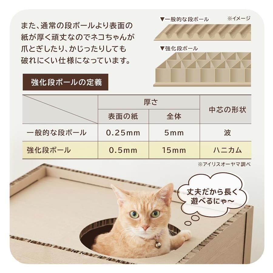 ◆強化段ボール使用のキャットタワー一般的な段ボールと比較して厚さは約3倍。中芯はハニカム構造で出来ています。耐荷重は約6kgでネコちゃんが飛び乗っても安心。